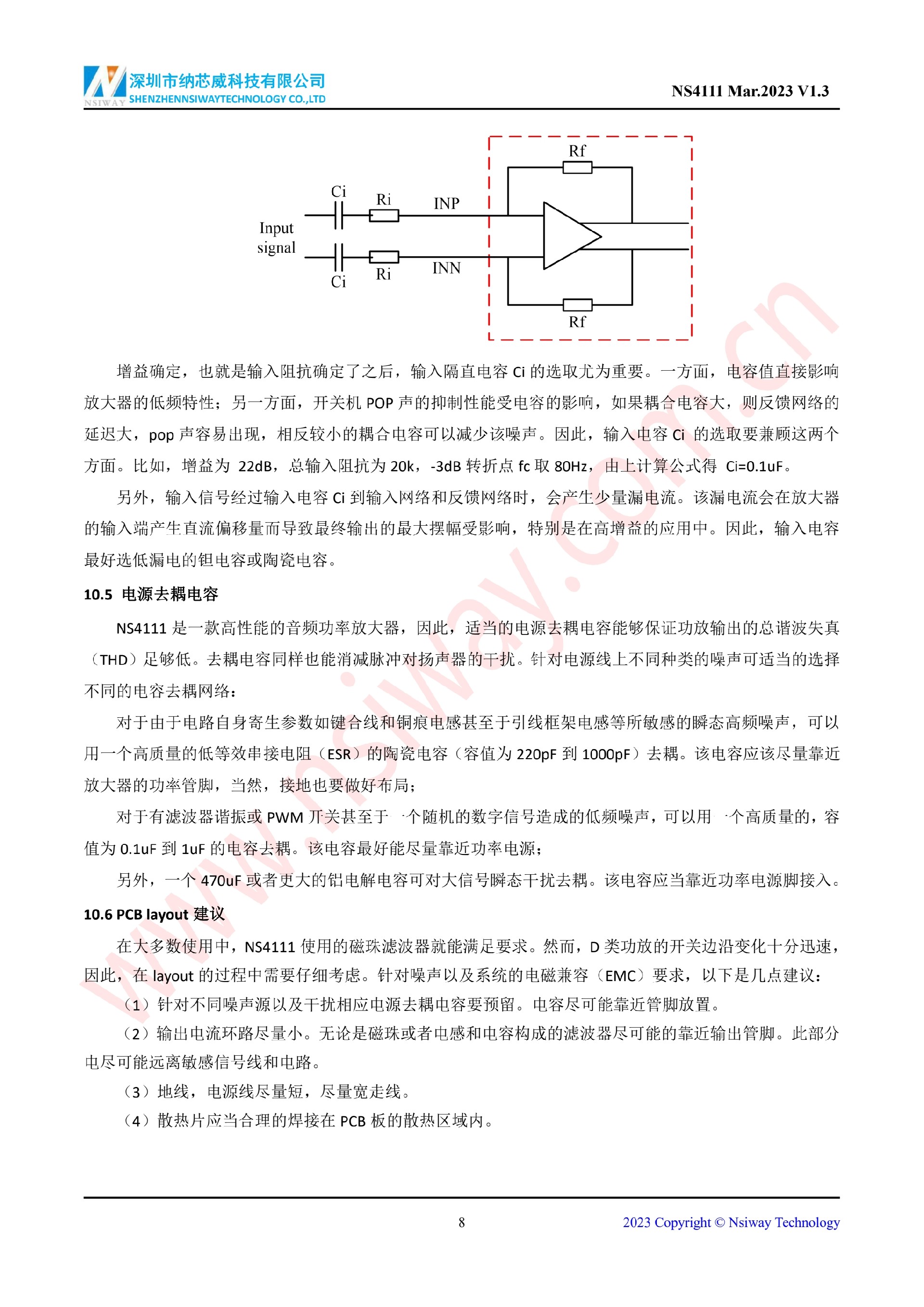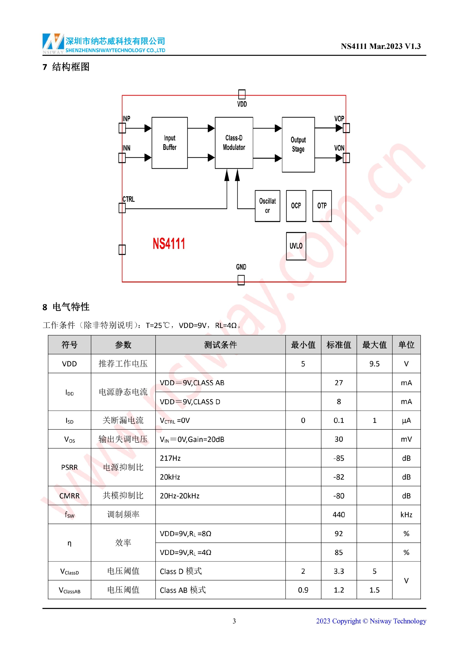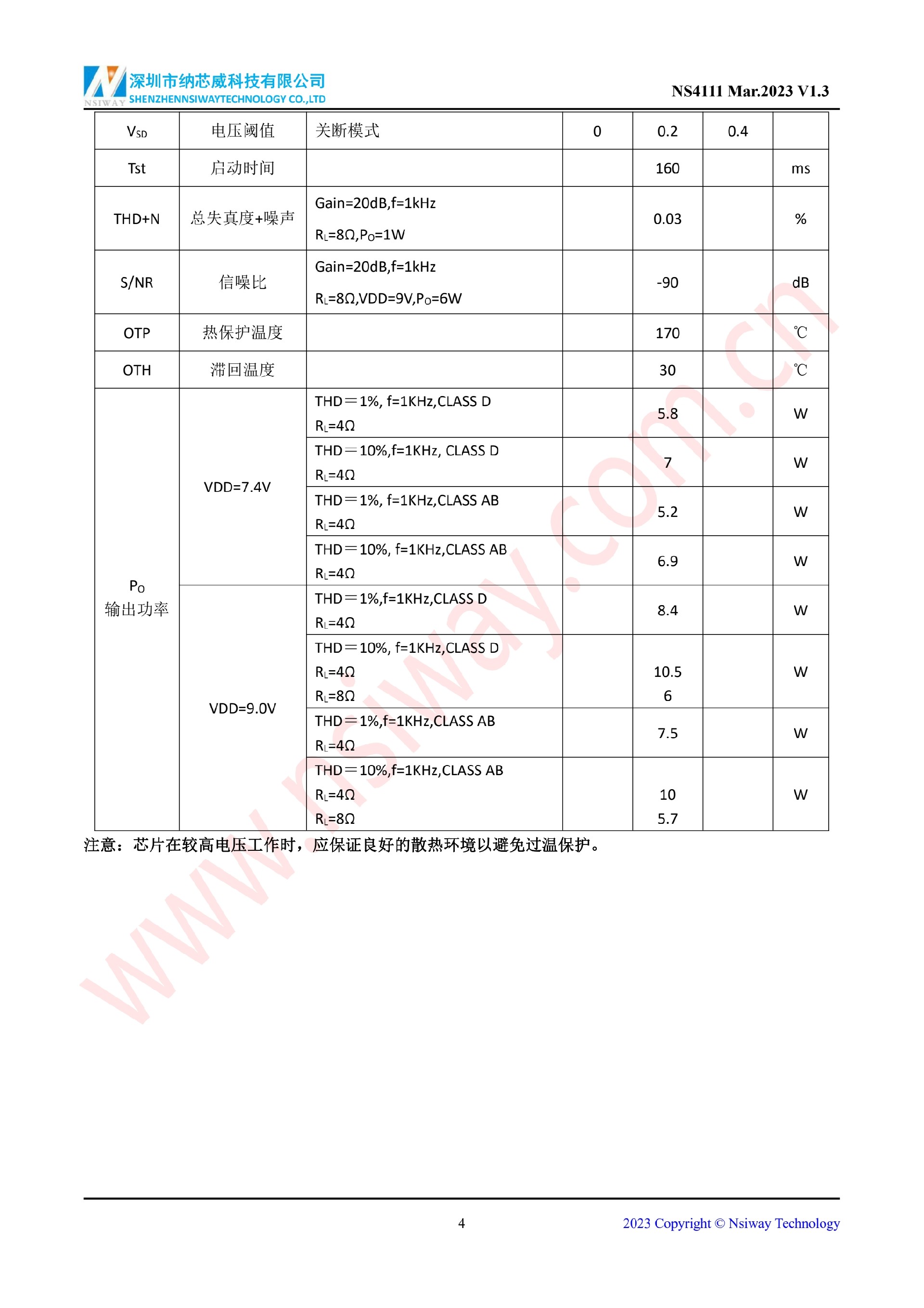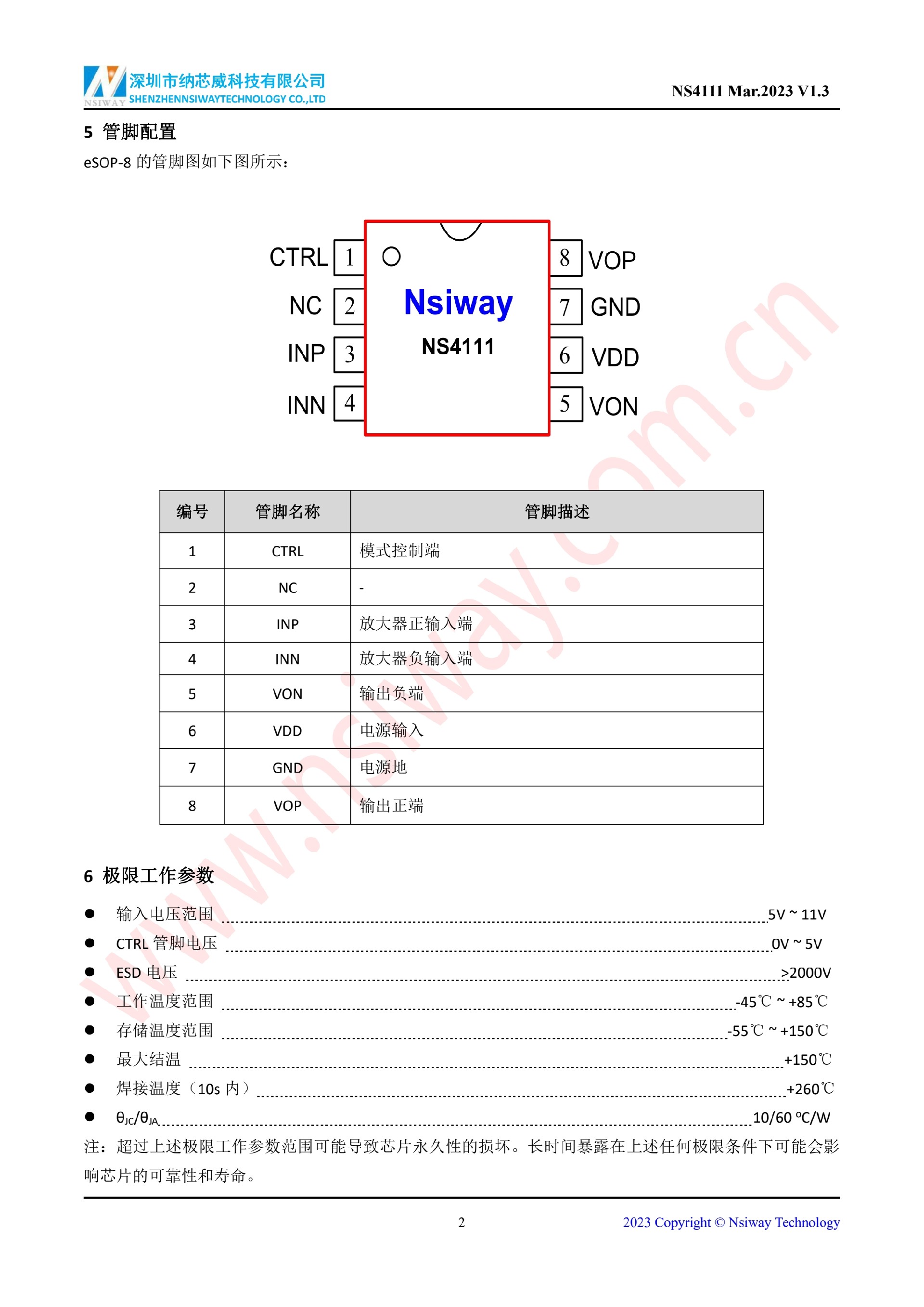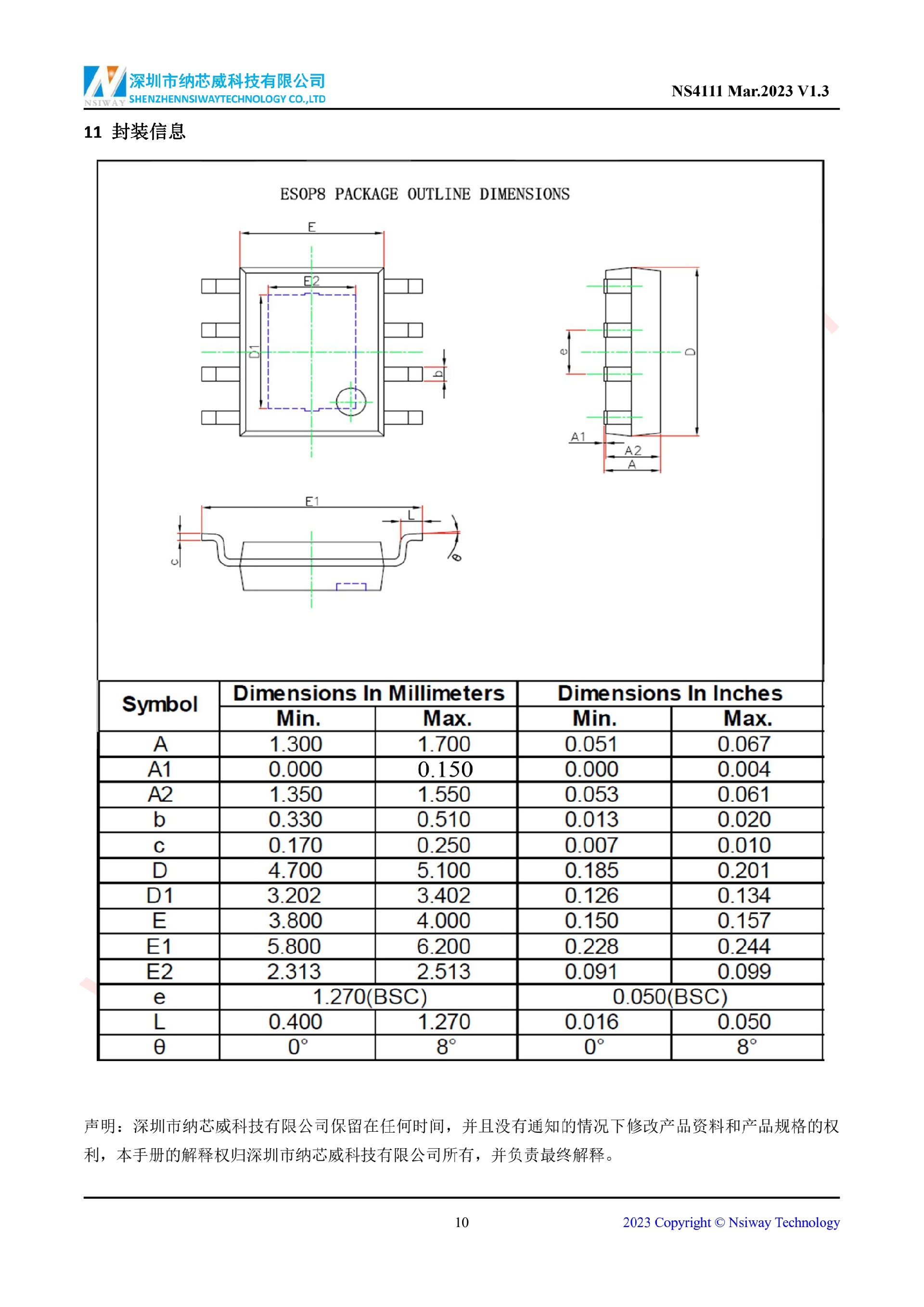 NS4111 10W 單聲道AB/D類雙模音頻功率放大器(eSOP-8)