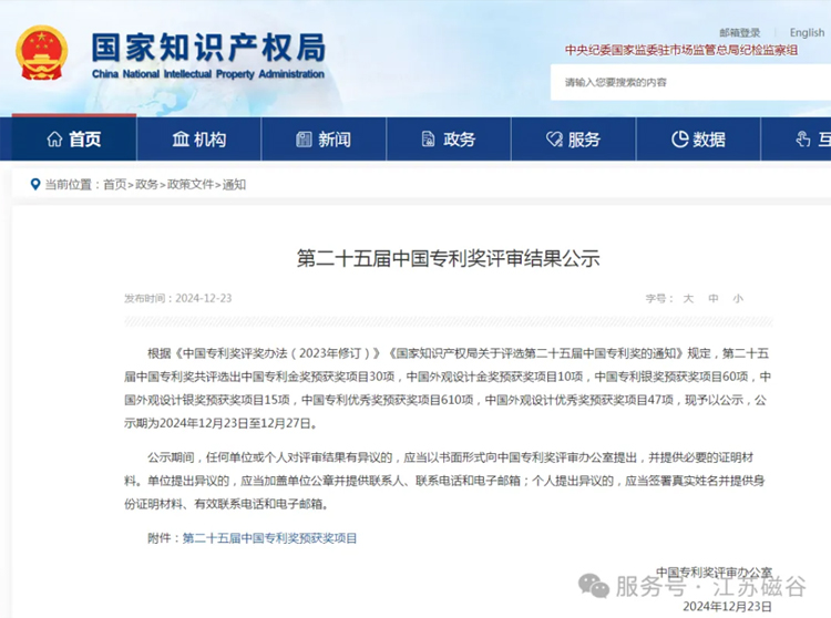 正值2025年元旦佳節(jié),江蘇磁谷迎來了一個(gè)振奮人心的消息:公司自主研發(fā)的《繞組式無刷耦合傳動(dòng)裝置》發(fā)明專利榮獲中國專利獎(jiǎng)優(yōu)秀獎(jiǎng)。這一殊榮不僅為公司的科技創(chuàng)新征程增添了輝煌篇章,更為新年的啟航注入了澎湃動(dòng)力與無限可能。 中國專利獎(jiǎng),由國家知識(shí)產(chǎn)權(quán)局?jǐn)y手世界知識(shí)產(chǎn)權(quán)組織共同設(shè)立,乃我國專利領(lǐng)域的至高榮譽(yù),其評(píng)選標(biāo)準(zhǔn)嚴(yán)苛,強(qiáng)調(diào)知識(shí)產(chǎn)權(quán)的創(chuàng)造、保護(hù)與應(yīng)用,對(duì)激發(fā)技術(shù)創(chuàng)新、驅(qū)動(dòng)經(jīng)濟(jì)高質(zhì)量發(fā)展具有深遠(yuǎn)影響。